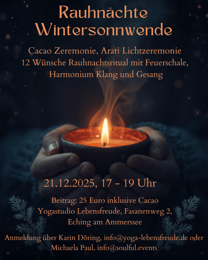 Die Wintersonnwende am 21.12.2025 mit der längsten Nacht des Jahres markiert den Beginn der Rauhnächte und ist die perfekte Zeit der Innenschau und Neuausrichtung für das kommende Jahr. Mit Meditation, Cacao Zeremonie, Lichtzeremonie, 12 Wünsche Rauhnachtsritual, Feuerschale und Harmonium Klang und Gesang stimmst Du Dich auf die Übergangszeit und den Start in das neue Jahr ein.